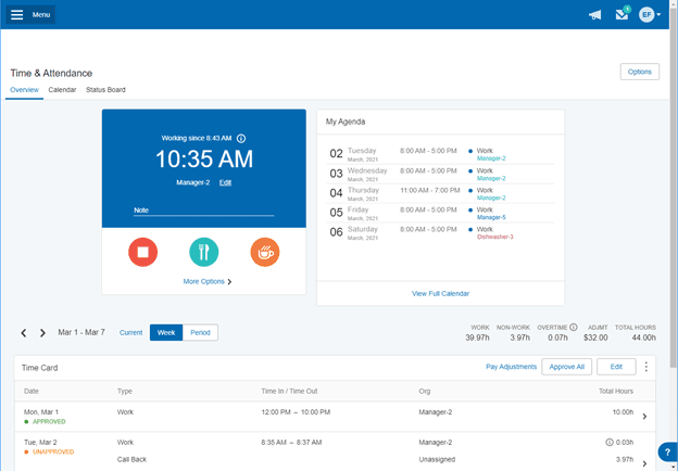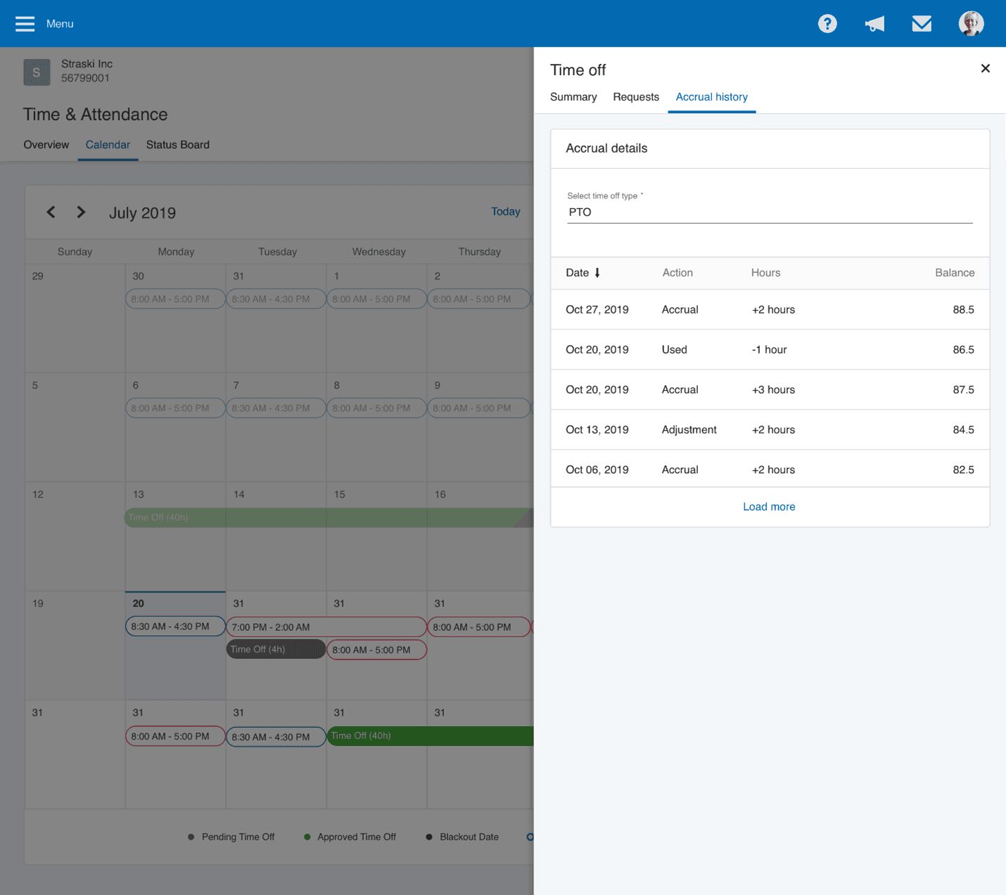 | PTO management | Employees can submit PTO requests and pay adjustments, and managers can approve or deny requests under their employee benefits and pay policies. |
