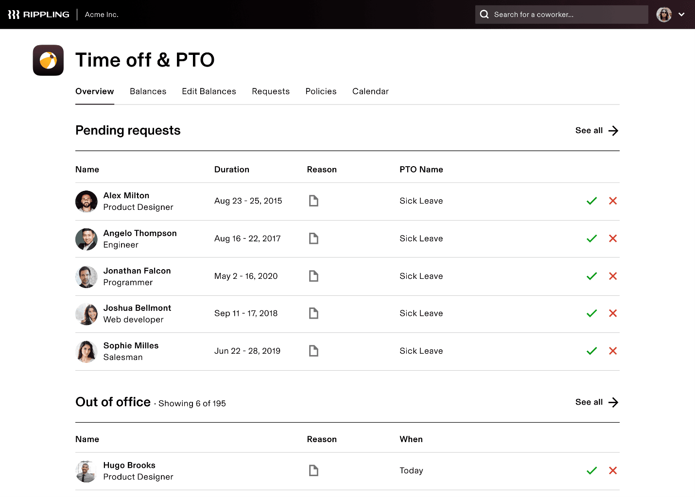 Employees can also submit time-off requests in the Rippling system. Their managers can review, approve, and deny their hours and time off. This is standard for time and attendance software.