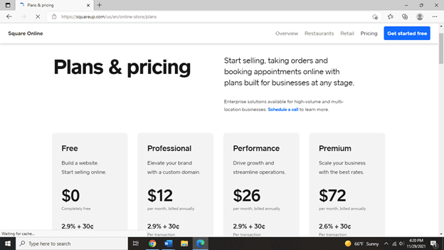 Square: Square offers four plans, ranging from free to $72 per month. Each plan includes an increasing spread of features, like abandoned cart tools, lower processing rates per purchase and discounted shipping. Square’s most expensive plan, Premium, is appropriate for large stores that process a high volume of transactions.