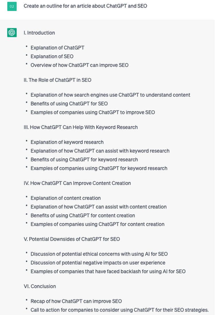 ChatGPT can suggest outlines based on the subject you provide. This can help focus ideas on a certain topic and increase efficiency. While the outlines may be overly expansive for your particular needs, they provide an easy starting point.